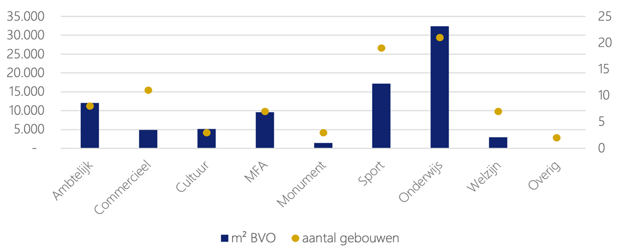 De gemeentelijke vastgoedportefeuille bestaat uit circa 90 objecten en ongeveer 100.000 m2 BVO (bruto vloeroppervlak). De omvang van de vastgoedportefeuille bleef in 2024 ongewijzigd. Volgens een landelijke gebruikte indeling voor het gemeentelijk vastgoed onderscheiden de volgende gebouwcategorieën: