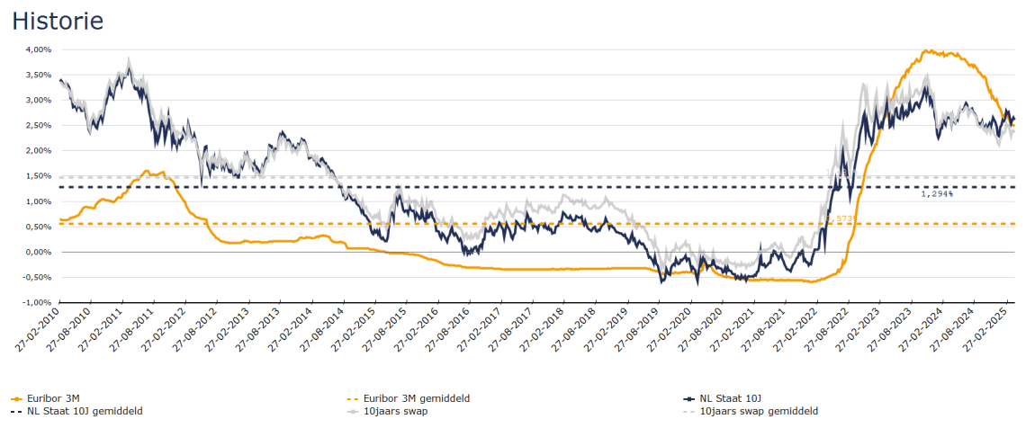 In onderstaande grafiek zijn de renteontwikkelingen over de periode 2010 tot en met 2024 weergegeven.