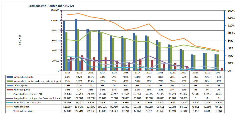 exploitatiebaten (netto schuldquote). Een gemeente met hogere inkomsten kan namelijk naar verhouding een hogere schuld aangaan. Hieronder wordt de ontwikkeling van de schuldpositie van Houten weergegeven.