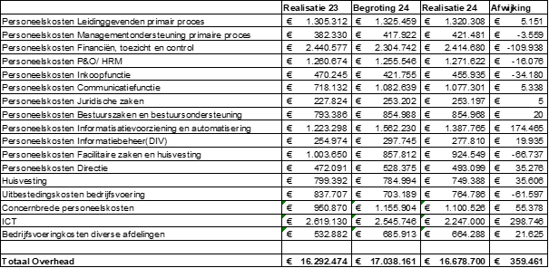 De overheadkosten 2024 bedragen 45,8% (begroot 48,2) van de totale kosten van de organisatie (apparaatskosten).